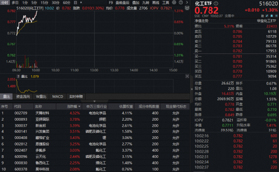 成份股方面,锂电、钾肥、磷化工等板块部分个股涨幅居前。截至发稿,天赐材料大涨超4%,亚钾国际、新宙邦、兴发集团、藏格矿业等多股跟涨超3%,拖累板块走势。