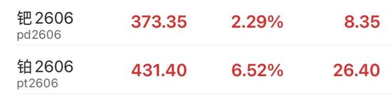 铂期货、钯期货今日在广期所上市交易。铂期货PT2606、PT2608、PT2610合约挂牌基准价均为405元/克;钯期货PD2606、PD2608、PD2610合约挂牌基准价均为365元/克。上市首日,主力合约均大幅高开。