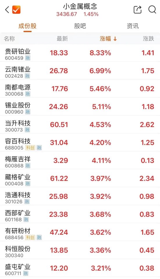 A股小金属概念拉升,贵研铂业(600459)涨超8%,西部矿业、藏格矿业等跟涨。