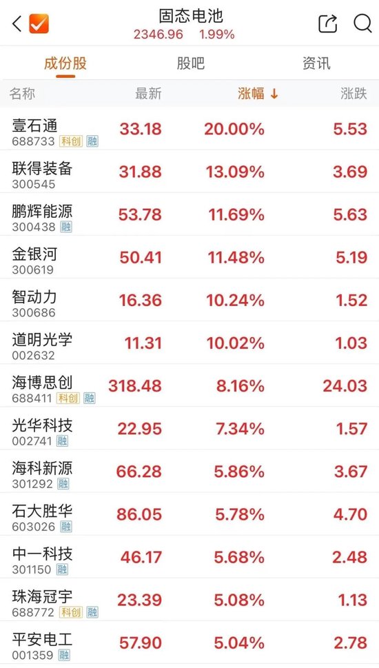 固态电池板块震荡走强,壹石通“20cm”涨停,联得装备、智动力(维权)涨超10%,海科新源、海博思创、中一科技、石大胜华、天赐材料等跟涨。